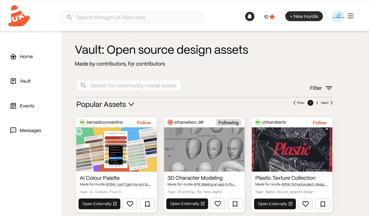 The Vault: A space for open-source community resources and assets for the UX design community. These can be anything, from a link to a YouTube video or Photoshop Mockup assets.