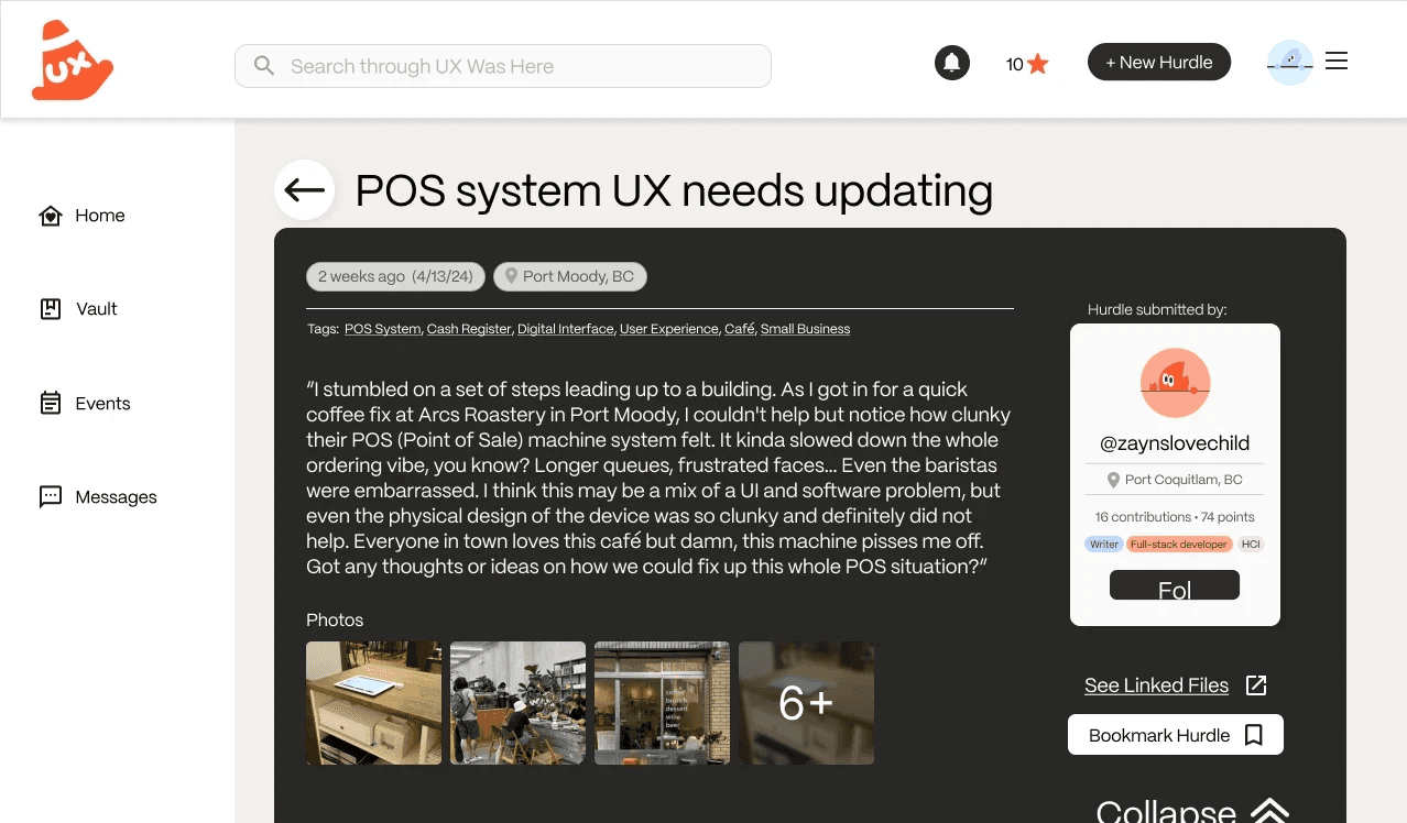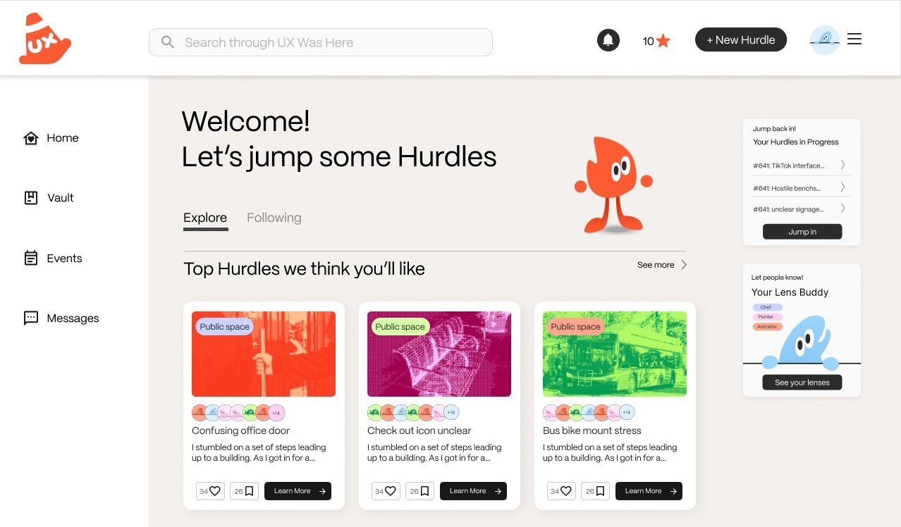 Hurdles: These are user-created UX problems that the community can help with. Users provide information about their hurdle, alongside photos and the specific problem space they are working in (UX, User Research, etc.), and the community can post their responses as a way to offer a different perspective.