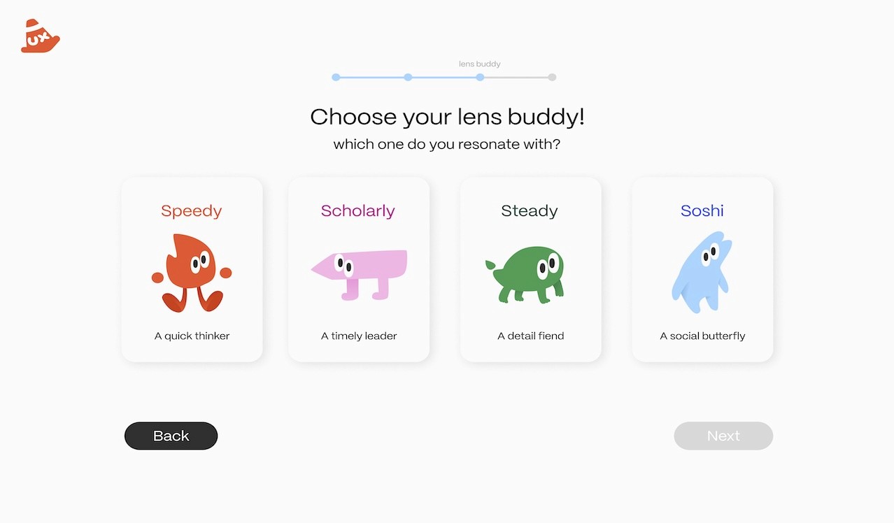 Onboarding: A way for users to get introduced to the platform while also making the experience more personalized. Users are asked questions about their general interests and also get to choose a “lens buddy” - an attribute that best describes how they approach the UX design process.