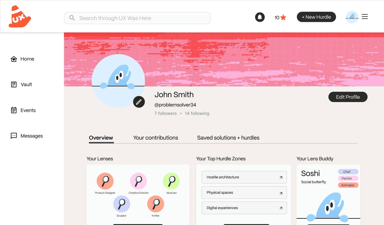 Profile: With any social media, a profile page allows the community to get to know you better. Here, the user can showcase their contributions to hurdles, what problem spaces they usually work in, and the statistics of how they’ve helped out others on the platform.